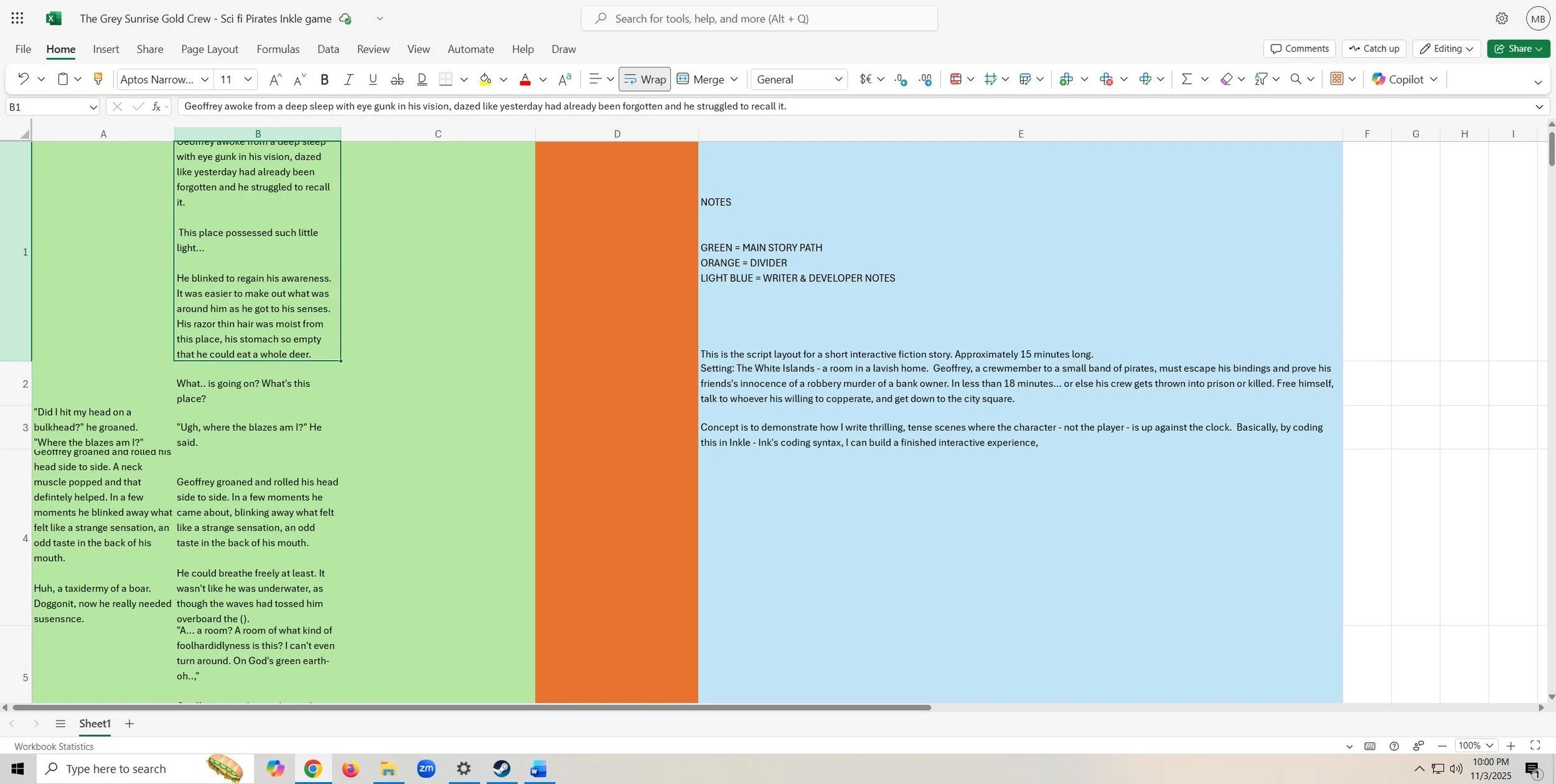 (Column B is the Golden Story Path. Columns A and C hold Branching Options at various points, and Development Notes in the blue one, as you can see. Looks kinda like fall colors, amirite?)