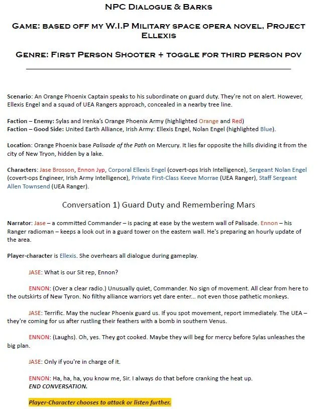 NPC Dialogue Conversation Examples, based off of my WIP novel, Project Ellexis